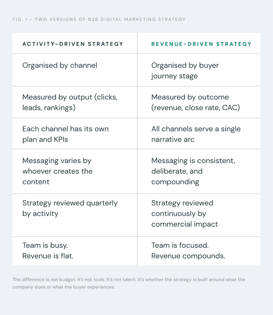 This is the central problem with most B2B digital marketing strategy. It answers the question “what should we do?” when the question that matters is “what needs to be true for this to produce revenue?”