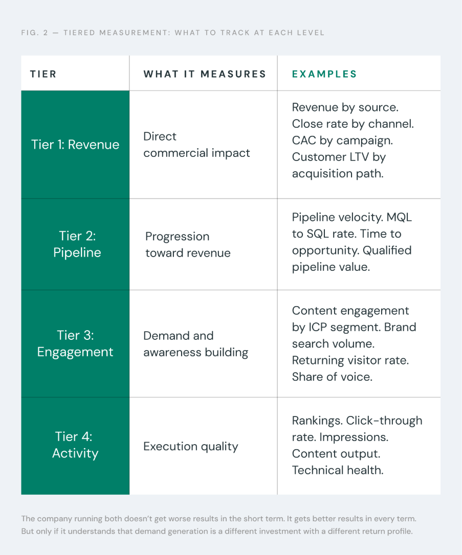Not everything can be measured by revenue immediately. Some channels contribute to awareness that converts months later. Some content influences deals that close through a different path entirely. A revenue-aligned strategy acknowledges this by measuring in tiers.