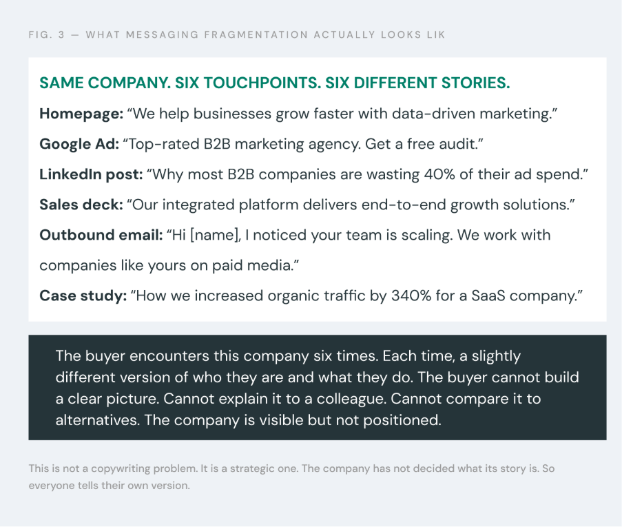 None of these are wrong individually. Each one was created by a competent person trying to communicate value. But collectively, they create a fragmented experience for the buyer. The buyer encounters the company five times and hears five slightly different versions of what the company does and why it matters.