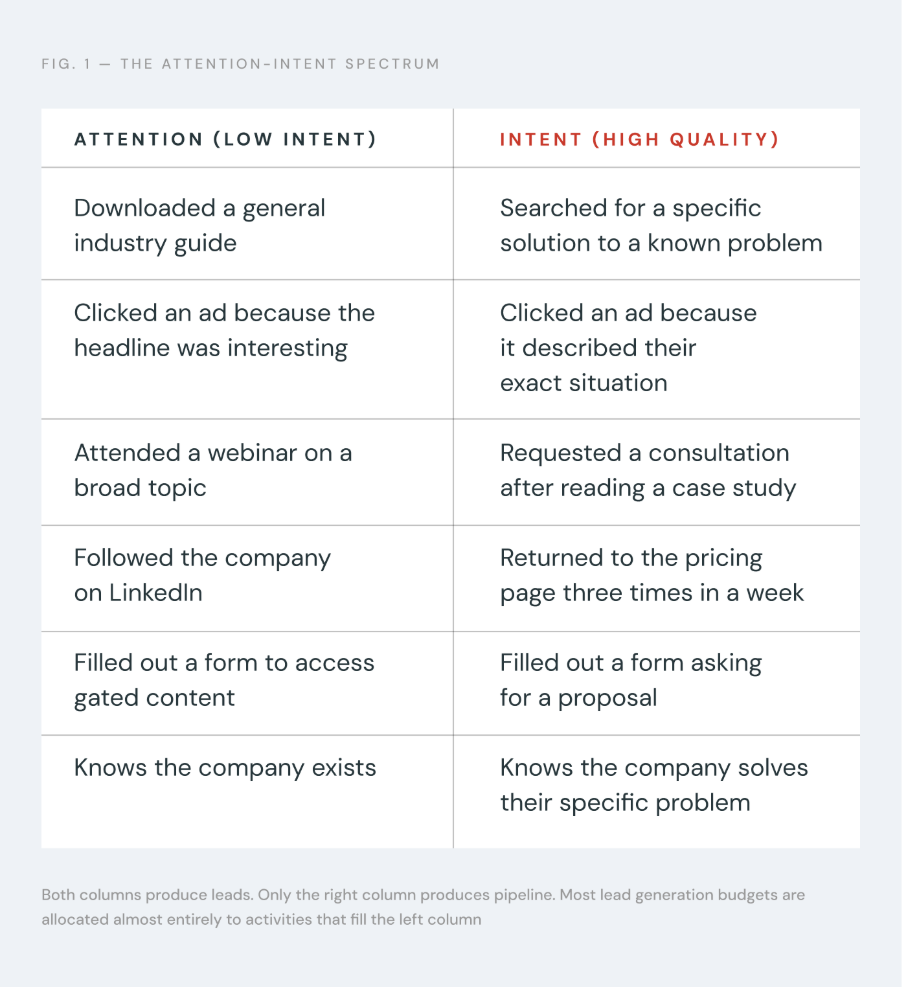 The deeper problem is that the lead generation strategy is built to attract attention, not to attract intent. And those are fundamentally different things.