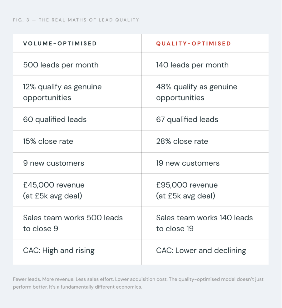 Which lead sources produce customers, not just contacts? Which content attracts buyers, not just readers? Which campaigns generate pipeline, not just clicks? Until you can answer these questions, you are optimising blind. And optimising blind defaults to optimising for volume, which is how the quality problem started.