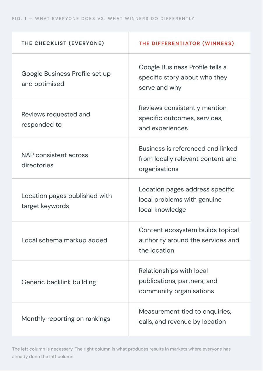 In a high-competition market, everyone has done this. Every competitor has a Google Business Profile. Every competitor has reviews. Every competitor has local citations. Every competitor has a location page. The technical baseline is met by everyone. The ranking factors that differentiated early movers have been commoditised.