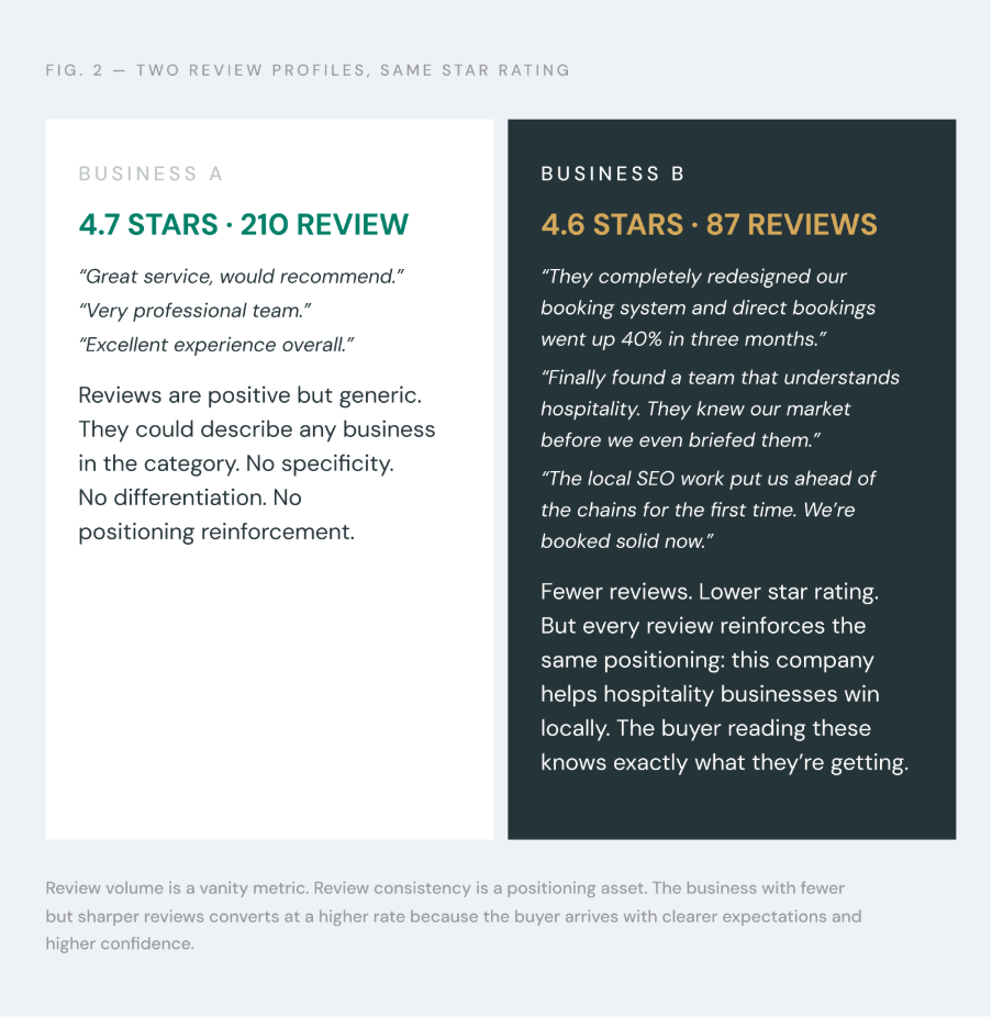 A business with 50 reviews that all tell the same story — this company solves this problem for this type of client, and does it well — will outperform a business with 200 reviews that are generic and scattered.