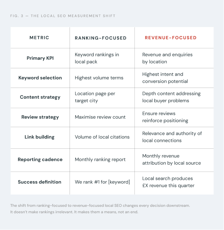 Measuring local SEO performance by revenue means tracking which keywords, which pages, and which listings are actually producing enquiries, calls, and sales. Not which ones are producing impressions. This changes what you optimise for. It changes which keywords you prioritise. It changes how you evaluate whether the local SEO strategy is working.