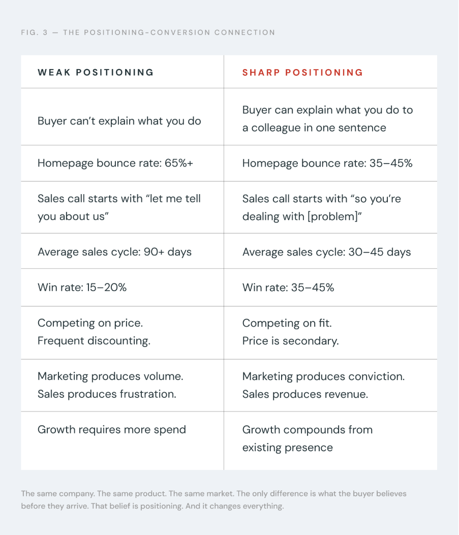 I have seen companies double their conversion rate without changing a single channel, a single budget line, or a single piece of marketing infrastructure. They changed their positioning. They got clear on the problem, the buyer, and the difference. Everything else followed.