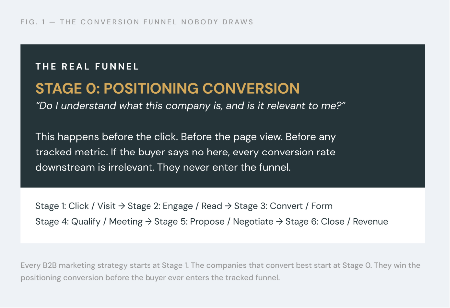 This is the positioning conversion. And it is the highest-leverage conversion in the entire funnel, because every other conversion depends on it. If the buyer doesn’t convert at the positioning level — if they don’t immediately understand what you are and why it’s relevant — nothing downstream matters. The landing page can be perfect. The form can be frictionless. The offer can be compelling. None of it helps if the buyer never arrives with the right expectation.